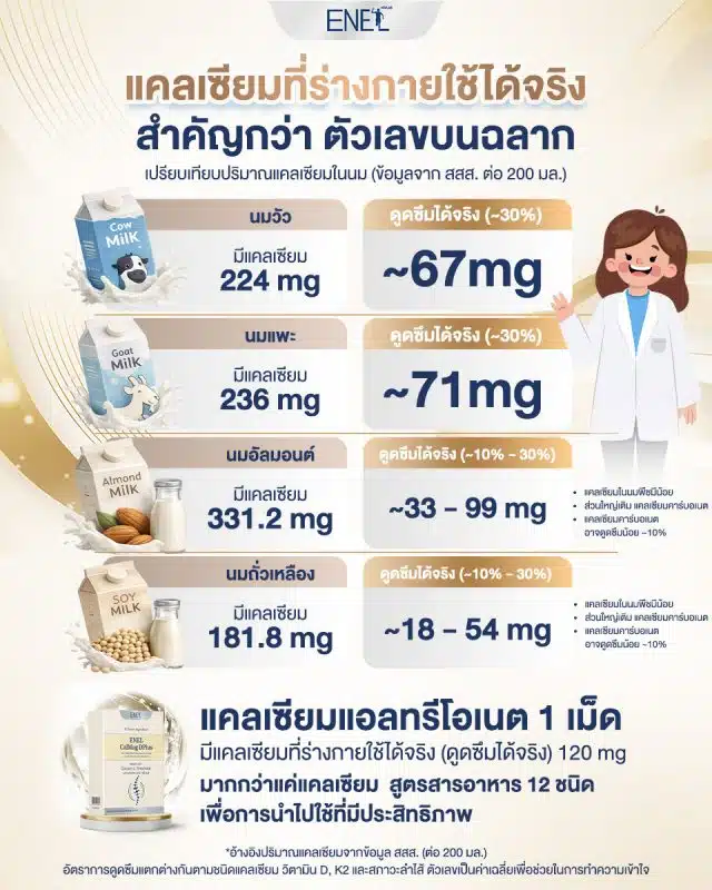 จากข้อมูลปริมาณแคลเซียมในนมแต่ละชนิดต่อ 200 มล. เช่น นมวัว นมแพะ นมอัลมอน และนมถั่วเหลือง(อ้างอิงข้อมูลจาก สสส.) (ThaiHealth) แม้ว่าบางชนิดจะมีปริมาณแคลเซียมสูง แต่โดยเฉลี่ย ร่างกายสามารถดูดซึมแคลเซียมได้ประมาณ 30% ของปริมาณที่มีอยู่ ทั้งนี้ อัตราการดูดซึมอาจแตกต่างกันตามชนิดของแคลเซียม และบริบทของแต่ละบุคคล (Heaney, 2001; NIH ODS) โดยเฉพาะ นมพืชที่เสริมแคลเซียม