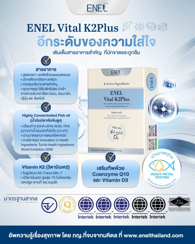 ENEL CalMag DPlus แคลเซียมแอลทรีโอเนตจากข้าวโพด Non-GMO โดย ภญ.มหิดล สูตรใหม่ นวัตกรรมสารสกัด เกรดพรีเมี่ยม ได้รับสิทธิบัตรจากสหรัฐอเมริกา เข้มข้นสูงที่สุดในท้องตลาด และเป็นแคลเซียมที่ ผ่านการรับรองจาก European Food Safty Autority (EFSA) โดย 1 เม็ด ให้แคลเซียมแอลทรีโอเนต 950 มิลลิกรัม พร้อมเสริมสารอาหารรวม 12 ชนิด ที่จำเป็นต่อกระดูกและข้อ รวม 12 ชนิด ตามอ้างอิงการศึกษางานวิจัย